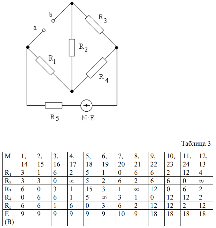 Задача 18. Используя метод эквивалентного активного двухполюсника, определить параметры его последовательной схемы замещения (Еэк и Rэк) относительно зажимов а и в. Значения сопротивлений (в омах) указаны в таблице 3.