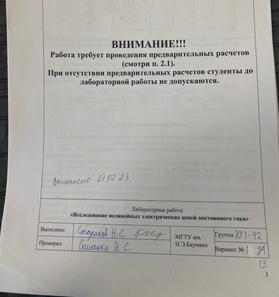 Для студентов МГТУ им. Н.Э.Баумана по предмету Электротехника (ЭлТех)Исследование нелинейных электрических цепей постоянного токаИсследование нелинейных электрических цепей постоянного тока
