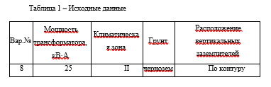 Спроектировать защитное заземление оборудования лаборатории. Заземляющее устройство заглублено на глубину 0,8 м. Для вертикальных заземлителей длиной lc = 3,0 м использовать стальные трубы диаметром d = 40 мм. Для соединительной полосы использовать стальную шину сечением 40 х 4 мм. Источник тока (трансформатор) подает напряжение в лабораторию 400 В. Варианты остальных исходных данных приведены в таблице 1.