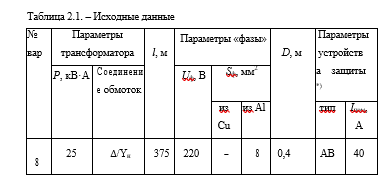 Подобрать площадь сечения нулевого провода, удовлетворяющая условию срабатывания максимальной токовой защиты, распределительного щитка лаборатории, к которому подведена линия (длиной l, м) от понижающего трансформатора с 10 кВ до 0,4 кВ, с заданным значением мощности P, кВ·А и соединением обмоток.