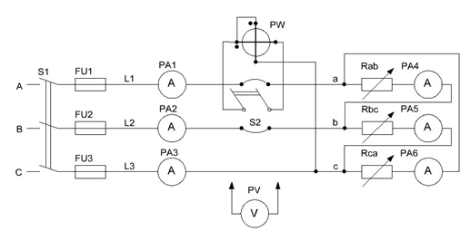 Схема 2. Трехфазная цепь при соединении электроприемников треугольником