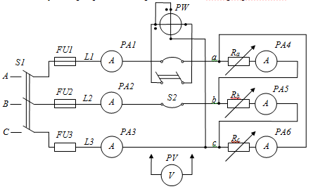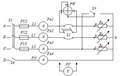 Рис. 1. Схема исследуемой трёхфазной цепи при соединении электроприёмников звездой