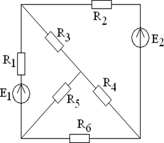 E1 = E2 = 36 В, R1 = R2 =2 Ом; R3 = R4 = 3 Ом; R5 = R6 = 4 Ом.