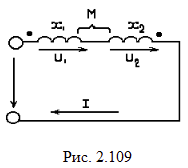 2-109.Р. Определить индуктивное сопротивление цепи рис. 2.109, обусловленное взаимной индуктивностью, а также напряжения U1, U2 и ток I, если U=180 В, x1=5 Ом, x2=20 Ом, коэффициент связи k=0,8, r1=r2=0. Указать неправильный ответ.