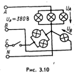 3-10.Р. Каждая фаза приемника энергии цепи рис. 3.10 содержит лампы накаливания, имеющие одинаковые номинальные мощности и напряжения. Определить напряжения UA и UB, когда отключен выключатель и оборван нейтральный провод. Считать, что сопротивления ламп не зависят от тока. Указать правильный ответ.