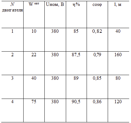 43.Р. Выбрать сечения проводов для питания трехфазных асинхронных двигателей (рис. 3.43), паспортные данные и расстояние от распределительного пункта до каждого из которых приведены в табл. 3.43. Допустимые токи проводов указаны в табл. 3.43а. Допустимая потеря напряжения не должна превышать 4 % номинального. Указать неправильный ответ.