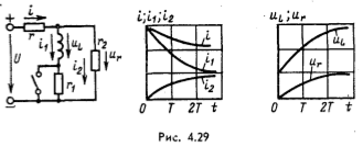 4-29. Р. По какому закону будут изменяться напряжения и токи в цепи рис. 4.29 при переходном процессе, вызванном размыканием выключателя, если r1 = r2 = r ? Указать неправильный график.