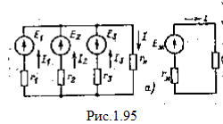 1-95.Р. Электрическая цепь рис. 1.95, а имеет следующие параметры: E1 =40 В, E2 = 80 В, E3 = 24 В, r'1 = r01 + r1 = 20 Ом, r'2 = r02 + r2 = 5 0м, r'3 = r03 + r3 = 12 Ом, rн =7 Ом. Определить параметры эквивалентной цепи (рис. 1.95,6) Eэк и rэк , а также токи I, I1, I2. Какой из ответов неправильный.
