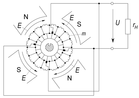 Как изменится напряжение работающего вхолостую генератора, если произойдет обрыв обмотки якоря, например в точке m рис. 9-15? Указать правильный ответ.