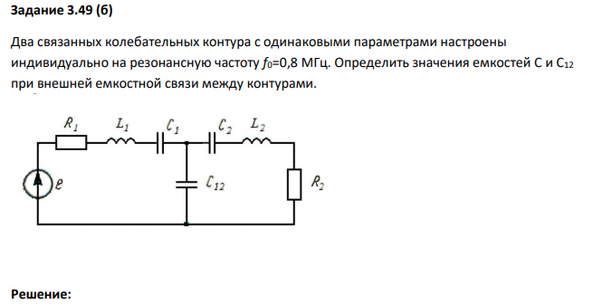 Задание 3.49 (б) Два связанных колебательных контура с одинаковыми параметрами настроены индивидуально на резонансную частоту f0=0,8 МГц. Определить значения емкостей C и C12 при внешней емкостной связи между контурами.