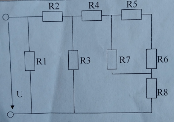 От источника постоянного тока получает питание цепь смешанного соединения резисто-ров. Схема дана в картинке. Дано: I1=15 А, R1=4 Ом, R2=6 Ом, R3=15 Ом, R4=6 Ом, R5=2 Ом, R6=3 Ом, R7=5 Ом, R8=1,5 Ом Определите эквивалентное сопротивление и величину т