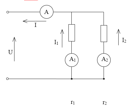 В сеть переменного тока частотой 50 Гц включены параллельно два резистора с активным сопротивлением r1 и r2. Напряжение сети u=Um∙sin(ωt+φ). Определить показания измерительных приборов, включенных в сеть, написать выражения мгновенного значения тока