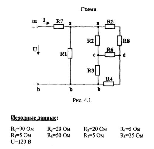 Для электрической цепи постоянного тока определить: эквивалентное сопротивление, общий ток в цепи, падение напряжения на резисторах. Выполнить проверку по 1 и 2 законам Кирхгофа. Выполнить проверку баланса мощностей.