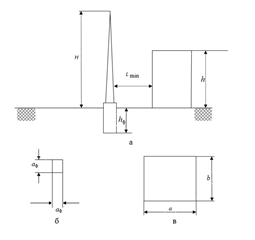 а– расположение защищаемого объекта и молниеотвода; б и в – геометрические размеры железобетонного фундамента и защищаемого объекта.