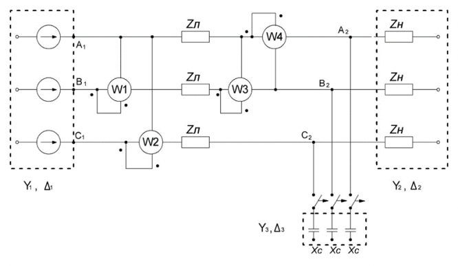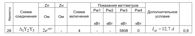 Определить напряжения, токи, мощности всех участков цепи и показания ваттметров в симметричной трехфазной цепи: 1.до подключения конденсаторов; 2.после включения конденсаторов, обеспечивающих заданную величину коэффициента мощности (cosφ). Построит
