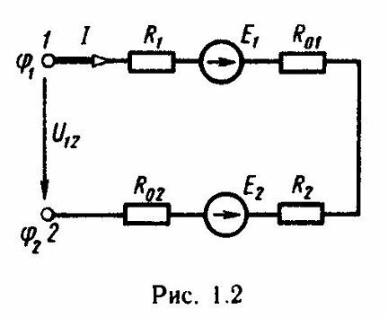 Определить ток в электрической цепи постоянного тока (рис. 1.2). ЭДС источников питания: Е1=40 В, Е2=20 В, внутренние сопротивления: R01=3 Ом, R02=2 Ом, потенциалы точек 1 и 2 цепи: φ1=80 В; φ2=60 В, сопротивления резисторов: R1=10 Ом; R2=10 Ом.