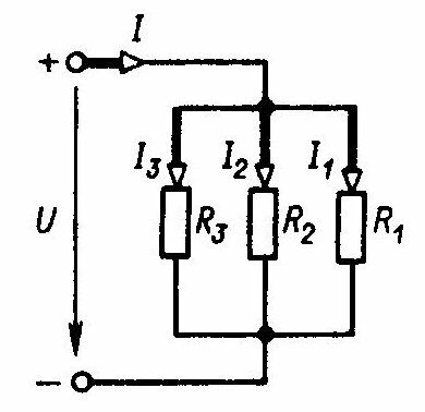 Для электрической цепи постоянного тока с параллельным соединением резисторов R1, R2 и R3 (рис. 1.18) определить ток I в неразветвленной ее части и токи в отдельных ветвях: I1, I2, I3. Сопротивления резисторов: R1=5 Ом; R2=10 Ом; R3=15 Ом, напряжение