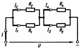 Для цепи постоянного тока, приведенной на рис. 1.21,определить общий ток I и токи I1, I2, I3, I4 в ветвях резисторов R1 - R4. К цепи подведено напряжение U=240 В, сопротивления резисторов R1=20 Ом; R2=15 Ом; R3=10 Ом; R4=5 Ом.