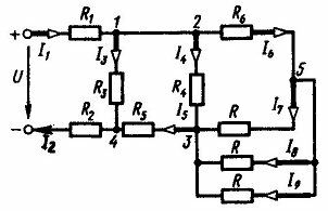 Определить токи I1I9,на участках электрической цепи постоянного тока (рис. 1.22). Сопротивления резисторов: R=30 Ом; R1=R2=2Ом; R3=15 Ом; R4=10 Ом; R5=4 Ом; R6=5 Ом. Напряжение питающей сети U=100 В.