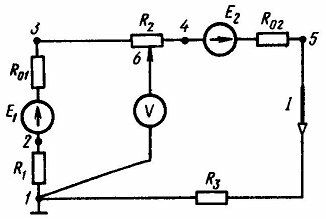 Рассчитать и построить потенциальную диаграмму для электрической цепи постоянного тока (рис. 1.37, а), если дано: ЭДС источников питания Е1=16 В; Е2=14 В, внутреннее сопротивление R01=3 Ом; R02=2 Ом, сопротивления резисторов R1=20Ом; R2=15 Ом; R3=10 Ом. Определить положение движка потенциометра, в котором вольтметр V покажет нуль, составить баланс мощностей для цепи. Как повлияет на вид потенциальной диаграммы выбор другой точки с нулевым потенциалом?