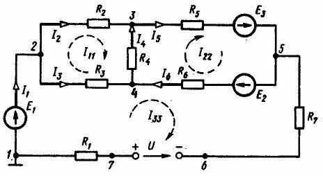 Электрическая цепь постоянного тока (рис. 1.50, а) содержит источники питания: Е1=50 В; Е2=20 В; Е3=45 В и резисторы с сопротивлениями: R1=10 Ом; R2=30 Ом; R3=50 Ом; R4=20 Ом; R5=1,0 Ом; R6=20 Ом; R7=10 Ом. Напряжение, приложенное к цепи, U=80 В. Вну