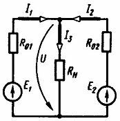 Для электрической цепи постоянного тока (рис. 1.35) определить токи I1–I3 в ветвях. ЭДС Е1=1,8 В; Е2=1,2 В; сопротивления резисторов: R1=0,2 Ом; R2=0,3 Ом; R3=0,8 Ом; R01=0,6 Ом; R02=0,4 Ом.