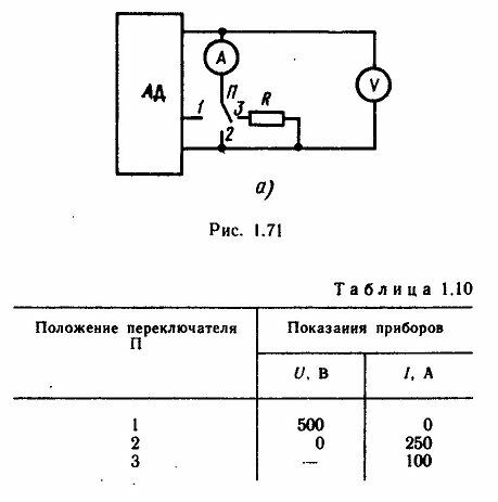 Методом эквивалентного генератора определить показание вольтметра V в электрической цепи с активным двухполюсником АД (рис. 1.71, а), если переключатель П находится в положении 3. Показания приборов (вольтметра V и амперметра А) для различных положен