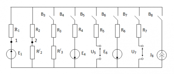 Главная » Учебные материалы » Электротехника (ЭлТех) » Решения задач » Несколько классов/семестров » Для электрической цепи постоянного тока, определить токи I1-I7 в ветвях резисторов R1-R7, составить баланс мощностей, а также определить режим работы источников питания и напряжения U12 между точками 1 и 2 цепи. Дано: E1 = 220 В; U7 = 30 В; R1 =