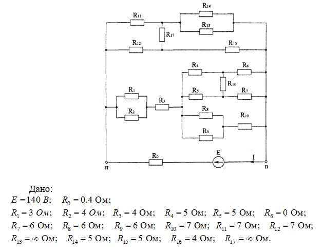 Для электрической цепи с параметрами, заданными в таблице определить эквивалентное (входное) сопротивление относительно зажимов источника питания и ток в ветви источника питания.