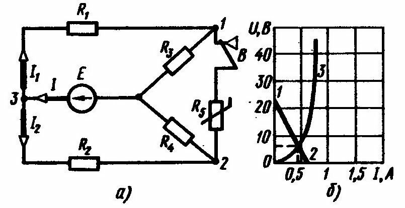 В электрическую цепь постоянного тока (рис. 2.2, а) включено нелинейное сопротивление R5. Определить ток I5 в нелинейном сопротивлении и напряжение U12, действующие между точками 1 и 2 цепи. Вольт-амперная харктеристика нелинейного сопротивления R5 (