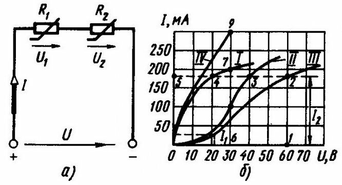 Для студентов по предмету Электротехника (ЭлТех)Нелинейные сопротивления R1 и R2, включенные последовательно в электрическую цепь постоянного тока рис. 2.3, а), имеют вольт-амперные харктеристики I Нелинейные сопротивления R1 и R2, включенные последовательно в электрическую цепь постоянного тока рис. 2.3, а), имеют вольт-амперные харктеристики I