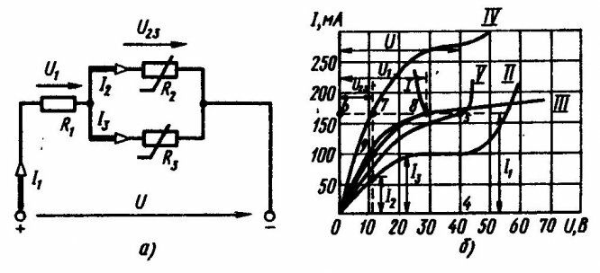 Определить токи I1 – I3 и напряжения U1 и U23 на нелинейных сопротивлениях R1, R2 и R3 при смешанном соединении их в электрической цепи постоянного тока (рис. 2.5, а), если приложенное напряжение U=40 В. Вольт-амперные харктеристики I, II и III нелин