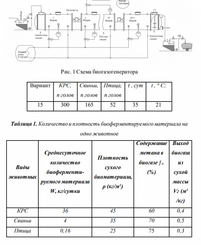 Определить объем биогазогенератора Vбио и суточный выход биогаза Vг вых в установке, утилизирующей навоз от животных: n1 = 300 коров, n2 = 165 свиней, n3 = 52 птиц, а также обеспечиваемую ею тепловую мощность N (кВт). Процесс переработки органических отходов осуществляется при температуре t = 21 ° С; время цикла сбраживания τ = 35 сут . Подача сухого сбраживаемого материала от одного животного идет со скоростью W , кг/сут (табл.1); выход биогаза из сухой массы νг , м 3 /кг (табл.1) . Содержание метана в биогазе составляет, % (табл1). КПД горелочного устройства η=0,68. Плотность сухого материала, распределенного в массе биогазогенератора, р сух , кг/м3 (табл.1) . Теплота сгорания метана при нормальных физических условиях Qн р =28 МДж/м3 . 2. Определить температурный режим. 3. Определить количество загрузок биогазогенератора за 1 год, если известно "время оборота реактора". 4.Сколько выработает станция биогаза за 1 год?