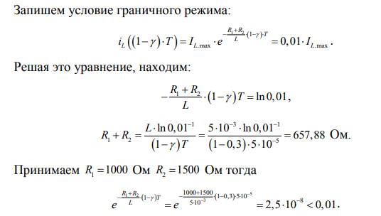 Определить значение сопротивления R1 (или R2 ), соответствующее граничному режиму работы схемы, и построить диаграммы токов и напряжений. При расчете принять следующее допущение: граничный режим достигается, когда минимальное значение тока в дросселе (напряжения на конденсаторе) составляет 1% своего максимального значения. Для граничного режима: а) вычислить максимальные значения тока транзистора и напряжения на транзисторе, выбрать транзистор (см. табл. П.1 и П.2 в Приложении); б) определить статические потери в транзисторе, используя следующие параметры: DS on   R – сопротивление сток-исток открытого транзистора, DSS I – ток утечки (для МОП-транзисторов); UCE on   – максимальное напряжение насыщения транзистора, CES I – ток утечки (для IGBT-транзисторов); в) определить динамические потери в транзисторе, используя следующие параметры: on t – время включения транзистора, off t – время выключения. Построить диаграммы тока транзистора, напряжения на транзисторе и мгновенной мощности на интервалах включения и выключения; г) выполнить тепловой расчет и рассчитать площадь охладителя для транзистора, зная температуру кристалла ( Tj ) и тепловое сопротивление кристалл-корпус ( R ).