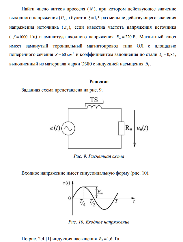 Найти число витков дросселя (N), при котором действующее значение выходного напряжения (Uнд) будет в   1,5 раз меньше действующего значения напряжения источника (Eд), если известна частота напряжения источника (f  1000 Гц) и амплитуда входного напряжения E m  220 B. Магнитный ключ имеет замкнутый тороидальный магнитопровод типа ОЛ с площадью поперечного сечения 2 S  60 мм и коэффициентом заполнения по стали 0,85 c k  , выполненный из материала марки Э380 с индукцией насыщения B S .