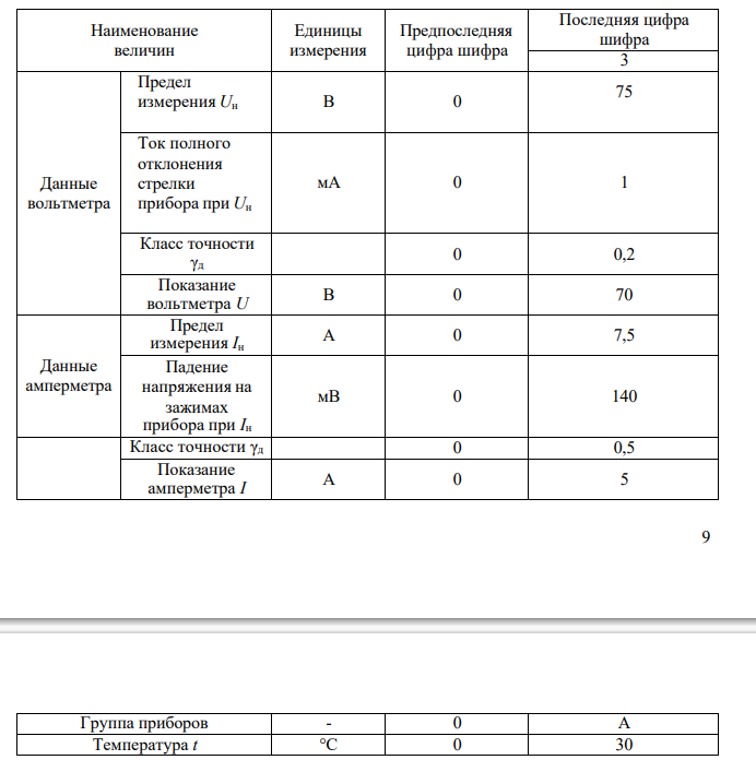 Для измерения сопротивления косвенным методом использовались два прибора: амперметр и вольтметр магнитоэлектрической системы. Измерение сопротивления производилось при температуре t приборами группы А, Б или В. Данные приборов, их показания, а также группа приборов и температура окружающего воздуха, при которой производилось измерение сопротивления, приведены в табл. Определить: 1. величину сопротивления ' по показаниям приборов и начертить схему; 2. величину сопротивления Rx с учетом схемы включения приборов; 3. наибольшие возможные (относительную γR и абсолютную R ) погрешности результата измерения этого сопротивления; 4. в каких пределах находятся действительные значения измеряемого сопротивления.