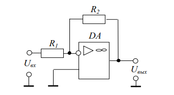 Чему равно выходное напряжение инвертирующего усилителя, если R1 = 500 Ом, R2 = 5000 Ом, U вх = 0,2 B?