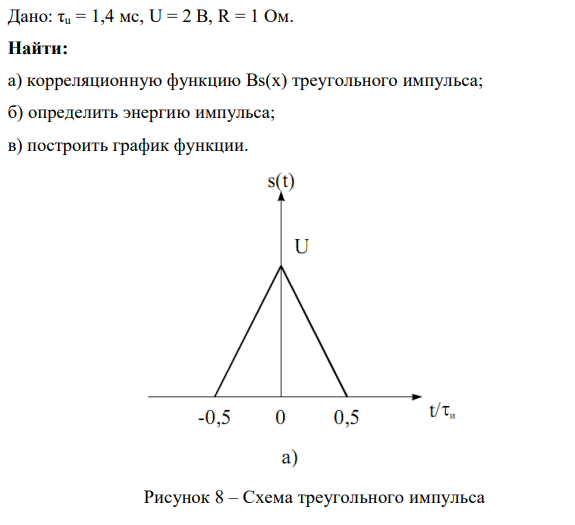 Найти: а) корреляционную функцию Bs(x) треугольного импульса; б) определить энергию импульса; в) построить график функции.