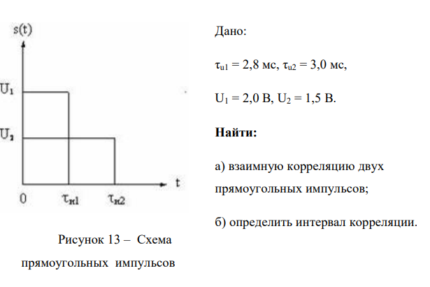 Дано: τu1 = 2,8 мс, τu2 = 3,0 мс, U1 = 2,0 В, U2 = 1,5 В. Найти: а) взаимную корреляцию двух прямоугольных импульсов; б) определить интервал корреляции.
