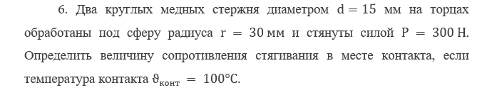 Два круглых медных стержня диаметром мм на торцах обработаны под сферу радиуса и стянуты силой Определить величину сопротивления стягивания в месте контакта, если температура контакта .
