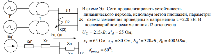 В схеме Эл. Сети проанализировать устойчивость динамического перхода, используя метод площадей, параметры схемы замещения приведены к напряжению U=220 кВ. В послеаварийном режиме линия Л2 отключена