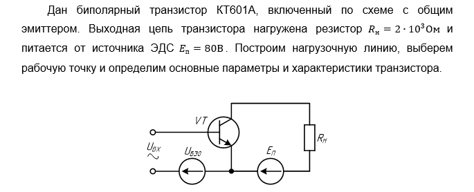 Дан биполярный транзистор КТ601А, включенный по схеме с общим эмиттером. Выходная цепь транзистора нагружена резистор и питается от источника ЭДС . Построим нагрузочную линию, выберем рабочую точку и определим основные параметры и характеристики транзистора.
