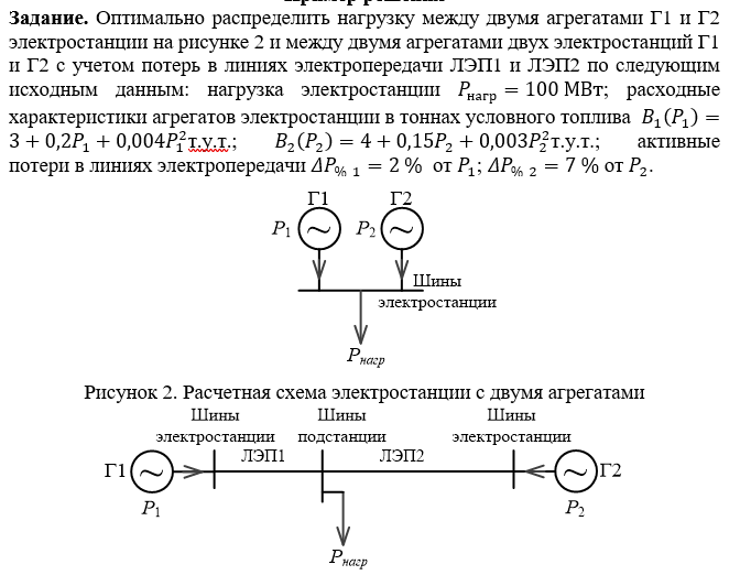 Задание. Оптимально распределить нагрузку между двумя агрегатами Г1 и Г2 электростанции на рисунке 2 и между двумя агрегатами двух электростанций Г1 и Г2 с учетом потерь в линиях электропередачи ЛЭП1 и ЛЭП2 по следующим исходным данным: нагрузка электростанции ; расходные характеристики агрегатов электростанции в тоннах условного топлива т.у.т.; т.у.т.; активные потери в линиях электропередачи от ; от .