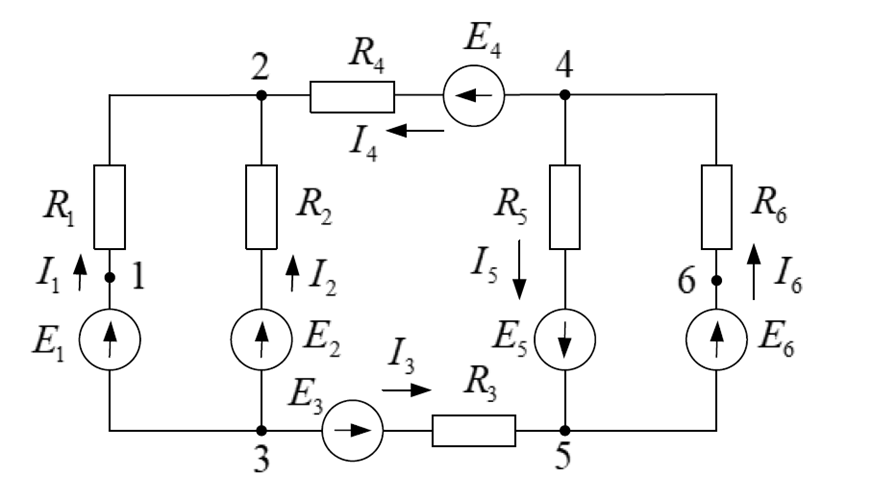 токи в ветвях: I1, I2, I4, I5, I6;