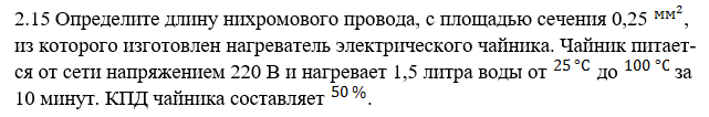 2.15 Опре­де­ли­те длину ни­хро­мо­во­го про­во­да, с пло­ща­дью се­че­ния 0,25 мм2 , из ко­то­ро­го из­го­тов­лен на­гре­ва­тель элек­три­че­ско­го чай­ни­ка. Чай­ник пи­та­ет­ся от сети на­пря­же­ни­ем 220 В и на­гре­ва­ет 1,5 литра воды от 25 до 100 за 10 минут. КПД чай­ни­ка со­став­ляет 50%.