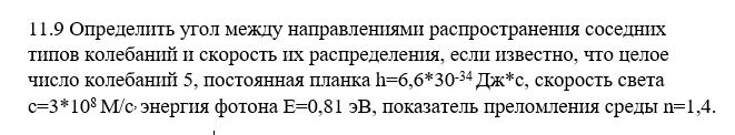 Определить угол между направлениями распространения соседних типов колебаний и скорость их распределения, если известно, что целое число колебаний 5, постоянная планка h = 6,6*30-34 Дж*с, скорость света с = 3*108 М/с, энергия фотона E = 0,81 эВ, показатель преломления среды n = 1,4.