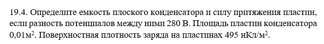 Определите емкость плоского конденсатора и силу притяжения пластин, если разность потенциалов между ними 280 В. Площадь пластин конденсатора 0,01 м2. Поверхностная плотность заряда на пластинах 495 нКл/м2.