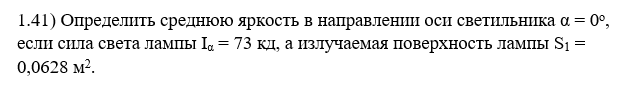 Определить среднюю яркость в направлении оси светильника α = 0о, если сила света лампы Iα = 73 кд, а излучаемая поверхность лампы S1 = 0,0628 м2.
