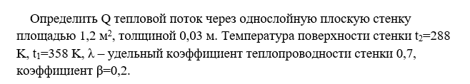 Определить Q тепловой поток через однослойную плоскую стенку площадью 1,2 м2, толщиной 0,03 м. Температура поверхности стенки t2=288 K, t1=358 K, λ – удельный коэффициент теплопроводности стенки 0,7, коэффициент β=0,2.