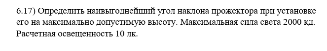 Определить наивыгоднейший угол наклона прожектора при установке его на максимально допустимую высоту. Максимальная сила света 2000 кд. Расчетная освещенность 10 лк.